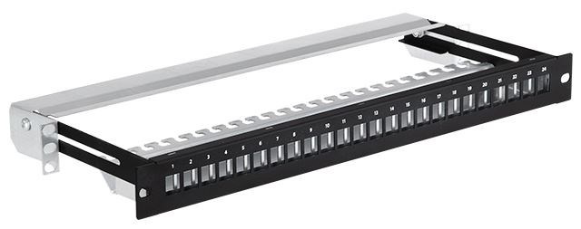Popis 19" modulární stíněný patch panel LEXI-Net 24port, černý, výsuvný