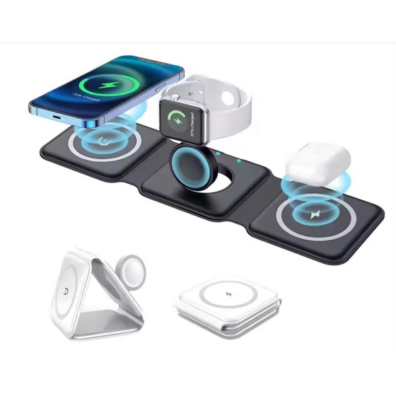 Kvalitní výkonná bezdrátová skládací 3 in 1 s podporou Apple MagSafe, iWatch, AirPods, ale i většiny telefonů, či příslušenství jiných značek podporujících bezdrátové QI nabíjení. Unikátní skládací řešení Vám umožňuje zvolit variantu použítí pouze jako podložku pro jedno zařízení, nebo stojánek případně nabíječku rozložit a nabíjet až tři zařízení. Nabíječku lze opět jednoduše složit do malé kompaktní podoby a v případě potřeby vložit do kapsy a jednoduše vzít kamkoli budete potřebovat.