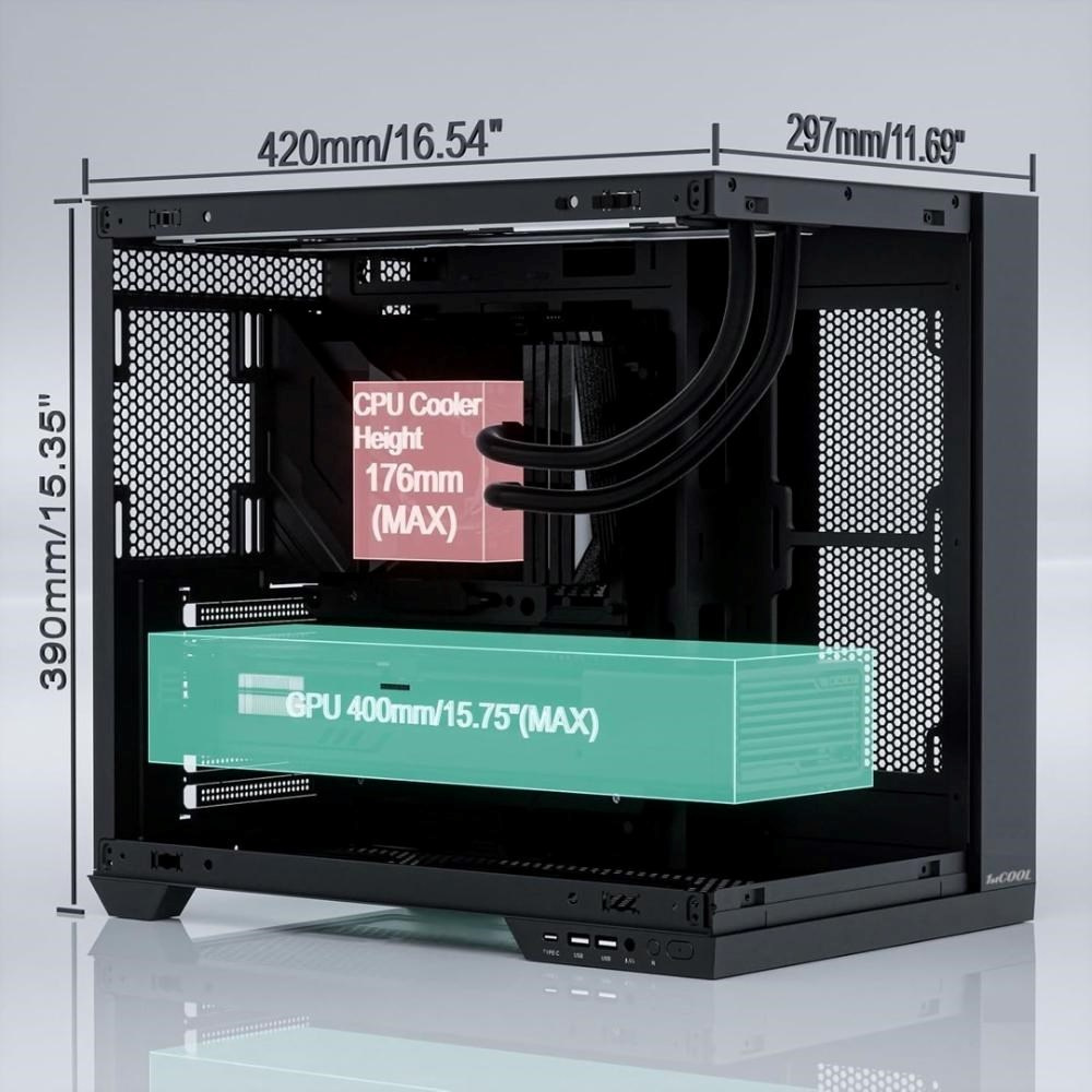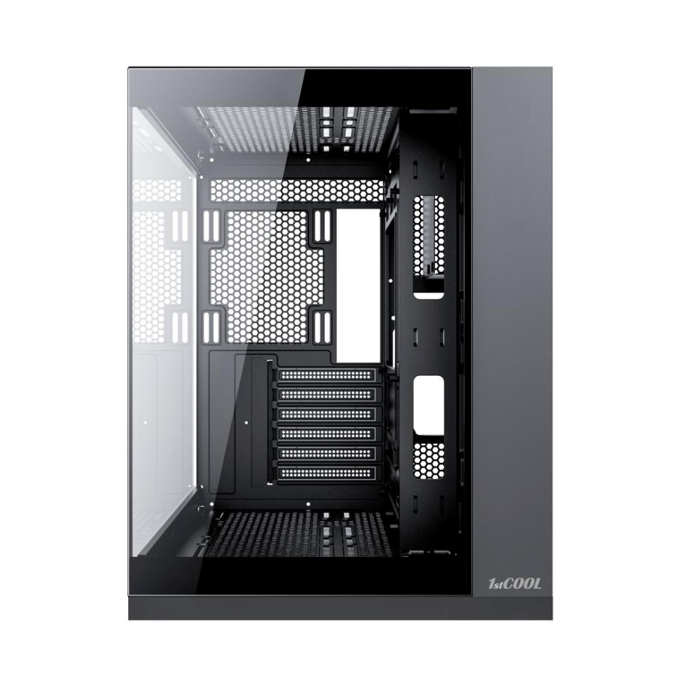 Navzdory kompaktním rozměrům nabízí prostor až pro 400mm dlouhé grafické karty, 176mm vysoké chladiče a vodní chlazení až do velikosti 360 mm. Uvnitř najdeš bohaté možnosti osazení ventilátory (až 9 kusů 120/140 mm), vybírat můžeš z několika variant 1stCOOL ventilátorů včetně aRGB řešení, případně doplnit i aRGB držák grafické karty.