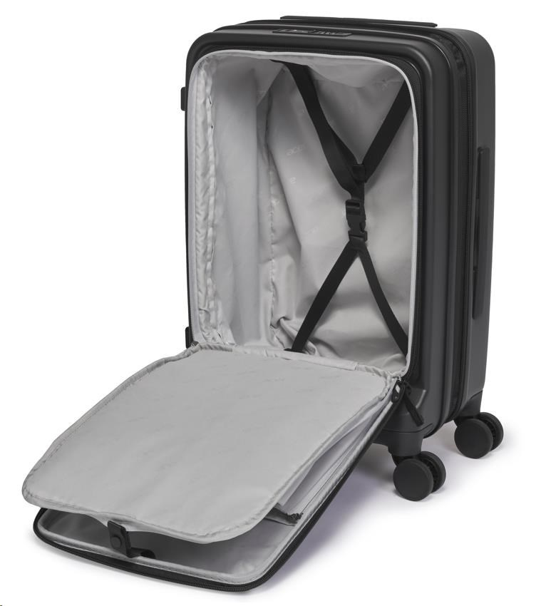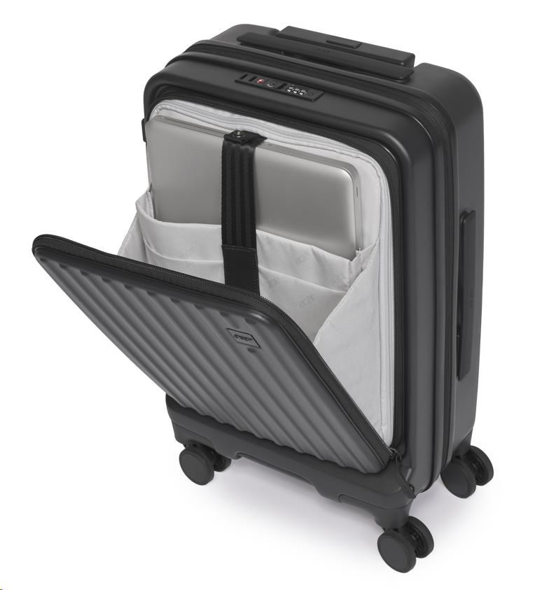 Acer Barcelona luggage 20", černý, pevný cestovní kufr, materiál: 100% recyklovaný PET, TSA kombinační zámek, přední otevírání, kapsa na notebook / tablet, 4 dvojité otočné kolečka, 53,5 x 20,5 x 35,5 cm, 3,1 kg