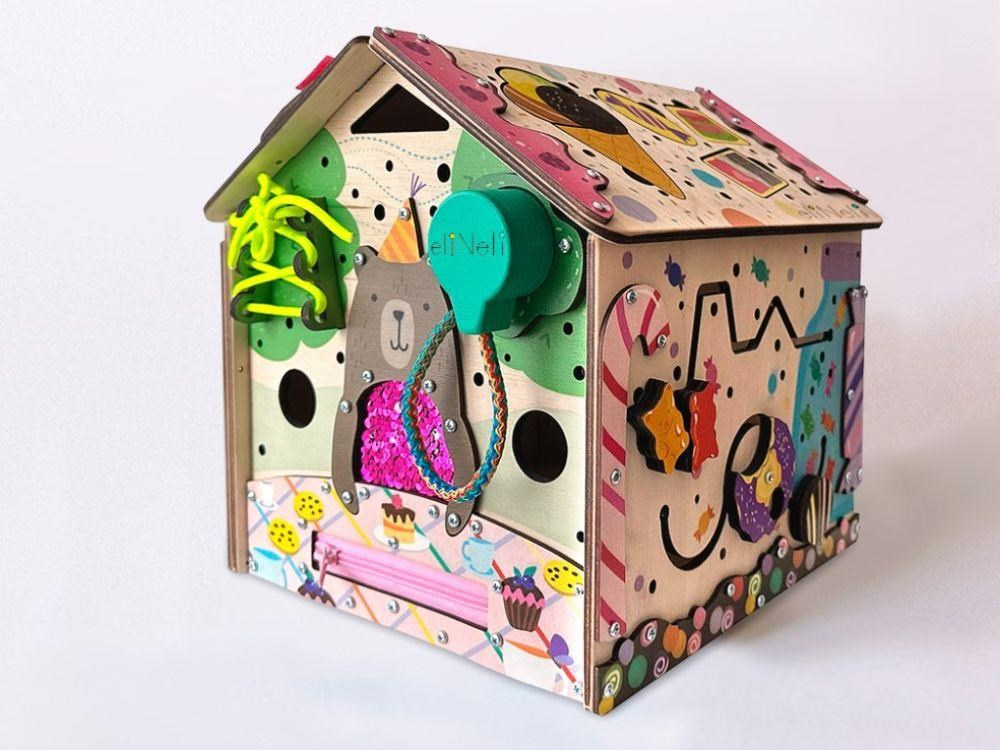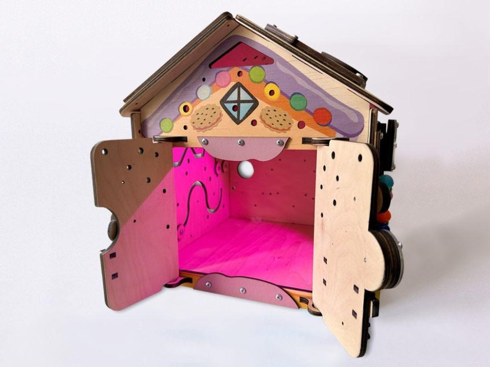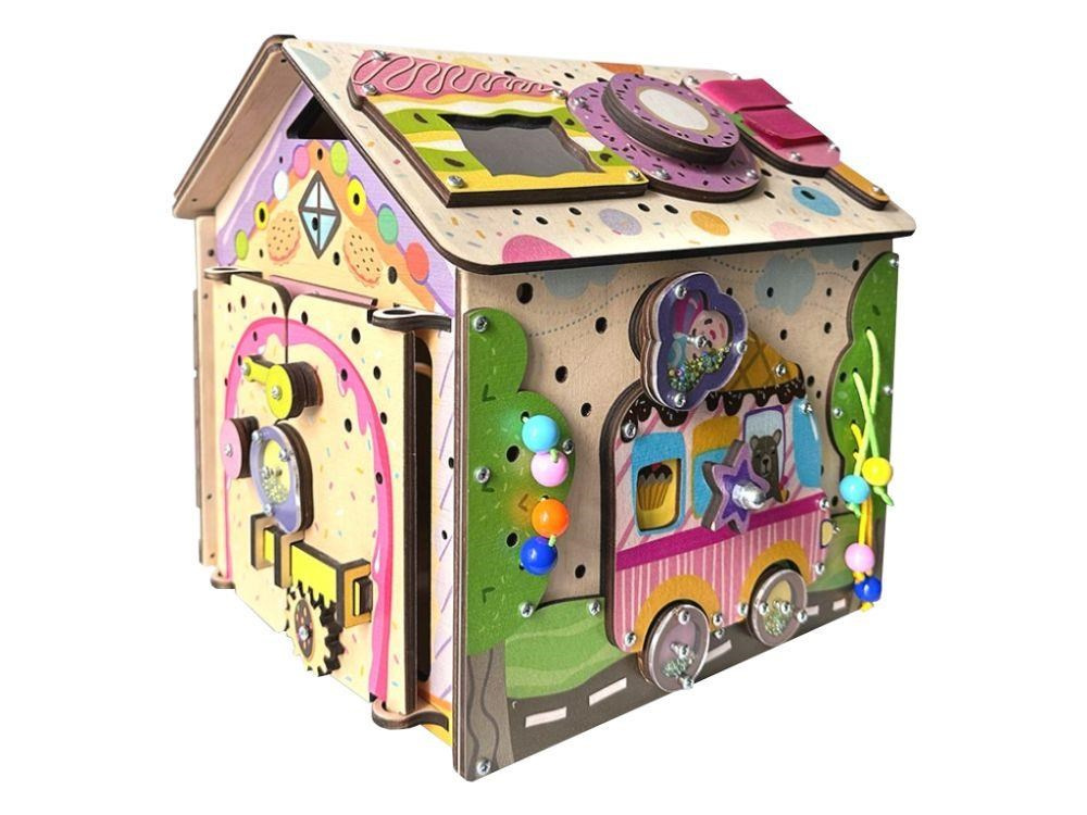 Originální svítící domeček activity board zavede děti do fantastického světa sladkostí. Se zmrzlinářským autem, s mlsným medvídkem a se spoustou montessori a hracích prvků se děti vydají za sladkým dobrodružstvím, při kterém se skvěle zabaví a zdokonalí své dovednosti. Každá strana activity boardu je originální a nabízí nespočet možností ke hře. Acitivity board domeček Cukrovinky je navíc svítící, po zapnutí světla se uvnitř domečku rozsvítí růžové světlo..