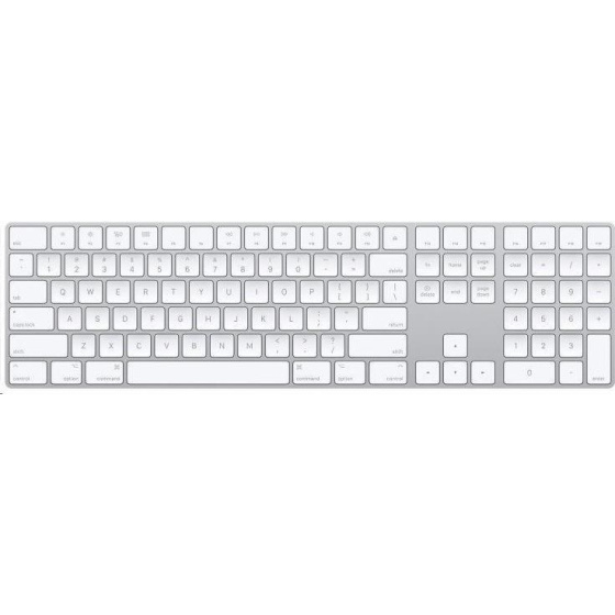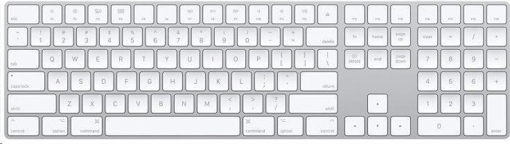 Bezdrátová klávesnice Apple Magic Keyboard vám přináší možnost pohodlného a rychlého psaní. Tato kouzelná klávesnice se vyznačuje kvalitním bílým provedením. Je vybavena číselnou klávesnicí, klávesami pro rychlé posouvání v dokumentech a velkými šipkami pro hraní her. Klávesy disponují nůžkovým mechanismem, který zajistí stabilitu a optimalizaci jejich pohybu. Zásluhou zabudované dobíjecí baterie má klávesnice výbornou výdrž. Pro připojení k Macům a zařízením s iOS slouží rozhraní Bluetooth a USB kabel s konektorem Lighting, který je určen také k nabíjení.