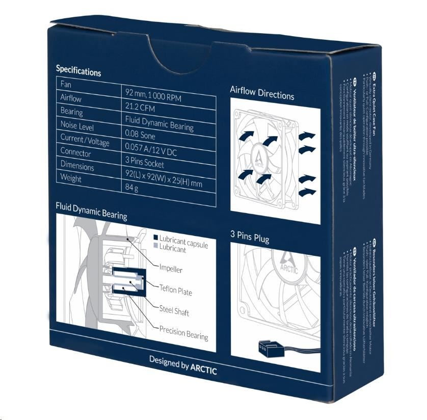 The Fluid Dynamic Bearing comes with an oil capsule that avoids lubricant leakage. Thus this bearing is as quiet as a sleeve bearing but comes with a significantly higher service life.