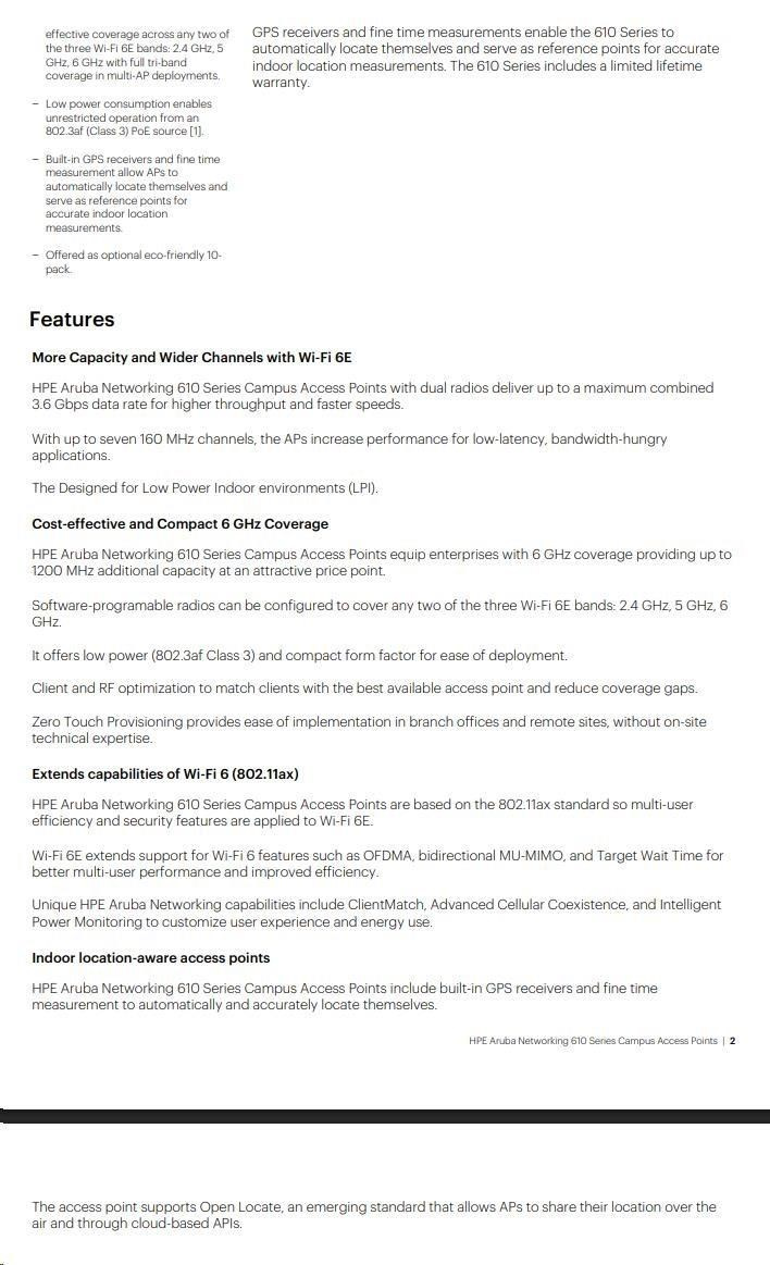In addition, Aruba's Wi-Fi 6 and 6E APs support Open Locate, an emerging standard that allows APs to share their location over the air and through cloud-based APIs, enabling mobile devices to locate themselves and applications to support network analytics.