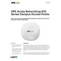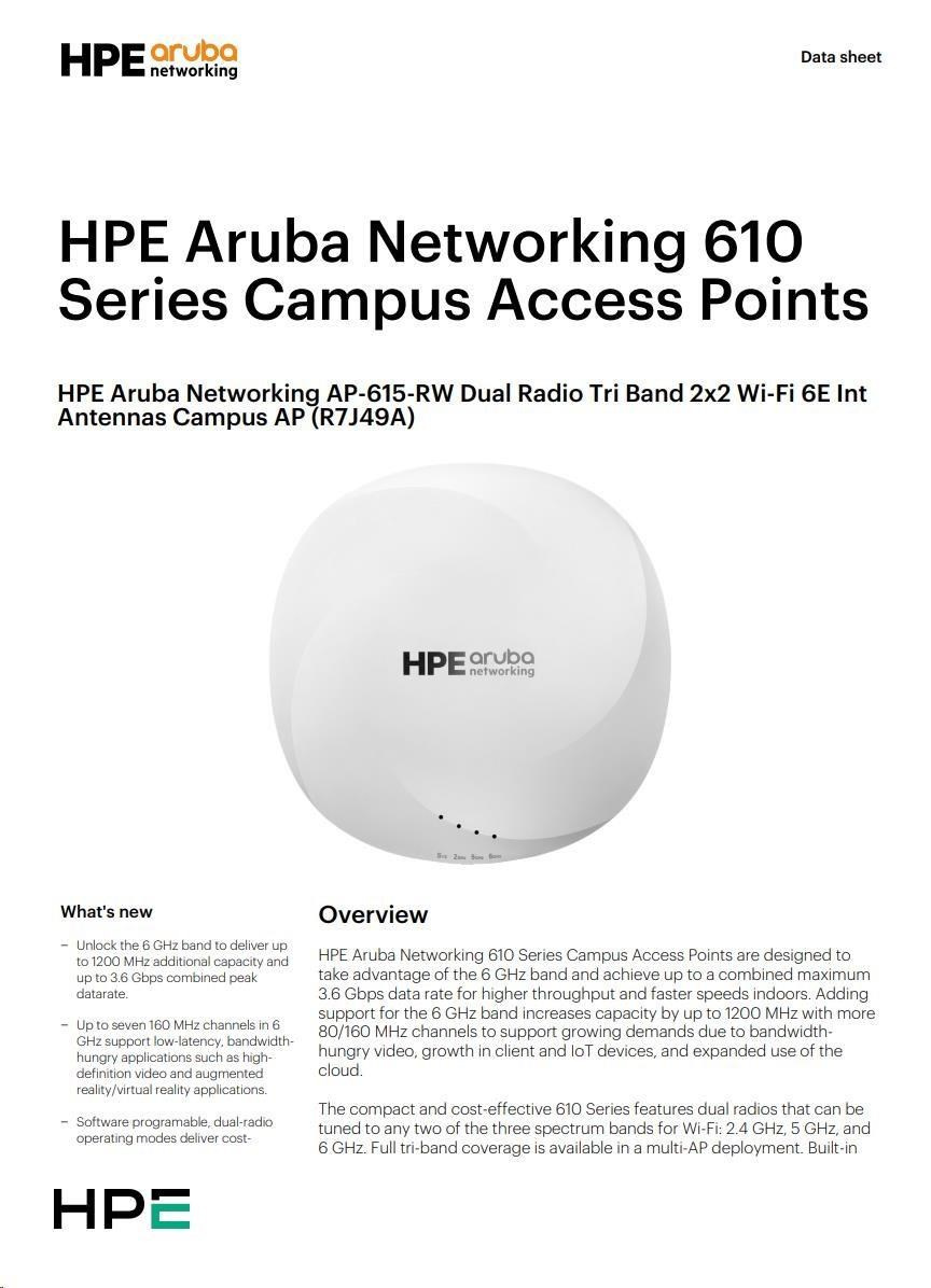 The Aruba 610 Series APs are designed to take advantage of Wi-Fi 6E and the 6 GHz band, which translates into far greater speeds, wider channels for multi-gigabit traffic, and less interference. Its two 2x2 MIMO radios deliver a combined peak data rate of up to 3.6 Gbps when configured for concurrent 5 GHz and 6 GHz operation.