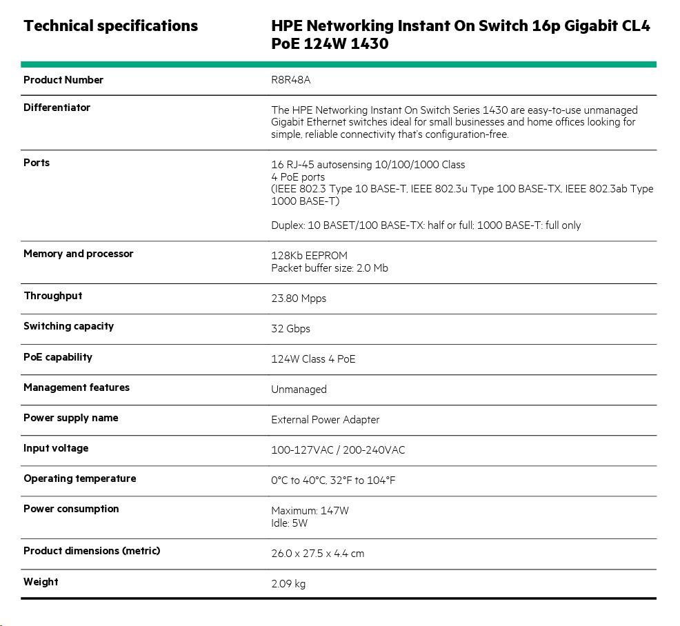 | HPE Networking Instant On Switch 16p Gigabit CL4 PoE 124W 1430 (R8R48A) | ||