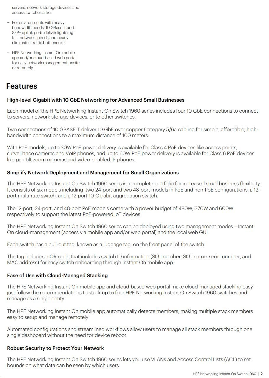 | In today's digital-first environment, small businesses face many challenges to stay afloat and competitive. With tight budgets and limited technical expertise, they're struggling to keep up with the explosion of devices and bandwidth-heavy applications running on the network. To optimize both performance and investment, small businesses need cost-effective, next-gen networking solutions. The Aruba Instant On 1960 Switch Series is an easy-to-use and affordable wired solution for networks supporting IT, mobile and cloud applications. Aruba Instant On 1960 Switches are advanced, smart-managed, fixed configuration Gigabit stackable switches designed for small and growing businesses that are easy to deploy and affordable. These switches are designed to scale as business grows, making adding more employees, devices and applications simple. Aruba Instant On 1960 switches are made to handle today's bandwidth-heavy applications like voice and video conferencing, enabling consistent connectivity to improve user experience and application performance.