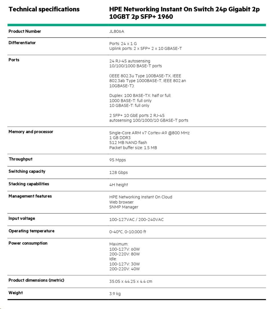 | The Instant On Differentiators The Aruba Instant On mobile app allows you to set up, manage, and monitor Instant On switches and access points directly from your phone. Within the app, you get guided step-by-step instructions to install Instant On devices to get your network up and running quickly - no technical expertise required. And cloud-based access allows you to access the network from anywhere, at any time. Cloud-Managed Stacking The Aruba Instant On mobile app and cloud-based web portal make cloud-managed stacking easy - just follow the recommendations to stack up to four (4) 1960 switches and manage as a single entity. The Instant On mobile app automatically detects members, making multiple stack members easy to setup and manage remotely. Automated configurations and streamlined workflows allow users to manage all stack members through one single dashboard without the need for device reboot. Luggage Tag Each switch has a pull-out tag, known as a luggage tag, on the front panel of the switch. The tag includes a QR code that includes switch ID information (SKU number, SKU name, serial number, and MAC address) for easy switch onboarding through Instant On mobile app. Non-Intrusive, Aesthetic Design Aruba Instant On switches are designed to complement the sleek and clean look of the Instant On access points, and to blend discreetly into your site's environment. The 8-port models, as well as the 24- and 48-port non PoE+ models, are fan-less, making them ideal for quiet office deployments. High Performance With Flexible Options The series consists of two (2) PoE switches, and two (2) non-PoE switches including 24- and 48-port Gigabit Ethernet switches with two (2) dedicated 10G SFP+ ports and two (2) 10GBASE-T uplink ports on 24-/48- port models. The series also includes a 12-port 10Gbps aggregation switch with four (4) 10G SFP+ ports to meet the bandwidth requirements of small businesses. Optimized User Experience The Aruba Instant On mobile app provides common workflows for Instant On switches and access points making it easier to configure, monitor and manage your network remotely without the need for additional hardware like cloud keys. You can also update firmware on your Instant On devices directly from the cloud whenever you want, from wherever you are. Site Inventory And Topology View The site inventory view shows all Instant On switches and access points on a single interface, and the topology view provides an intuitive structure of all Instant On devices deployed on the network - allowing you to quickly identify non-functioning devices and troubleshoot accordingly. Network issues can be easily diagnosed with connectivity tests like Ping and Traceroute. Multi-Site Remote Management The cloud-hosted web interface and mobile app make it easy to remotely manage multiple sites, multiple networks, distributed deployments and multi-tenant deployments. Each site is logically separated and has its own configuration, statistics, guest portal, and admin read/write privileges. Instant On allows you to create three admin accounts per site, offering the option to lock accounts from accidental deletion or to allow your account to be managed by a trusted partner. Built-In Security Built-in security features protect your network from external threats by blocking malware attacks and keeping unauthorized users off the network. Network traffic can be filtered and access restricted based on MAC and IP address. No Hidden Fees All features are included in the price of the hardware - there are no recurring subscription or licensing fees. Expert-level support and industry leading limited lifetime warranty are also included, along with chat support for the life of the product. |