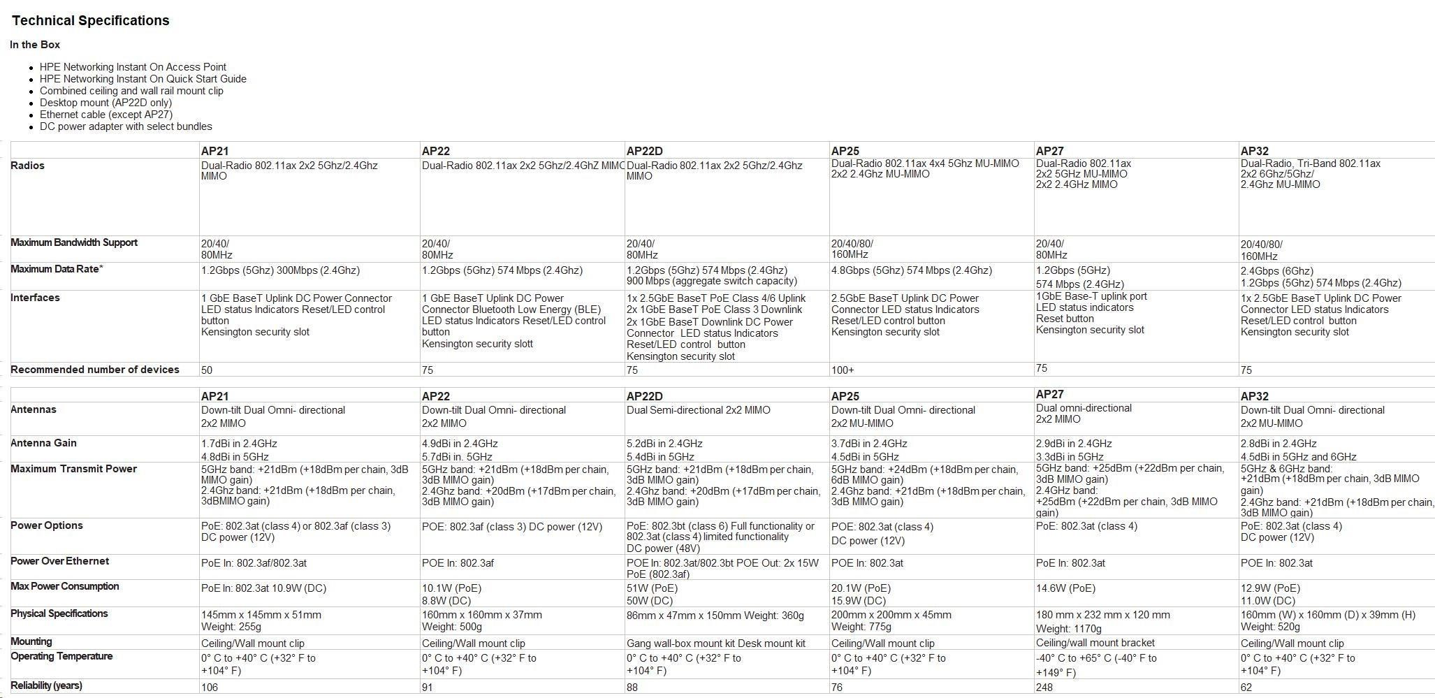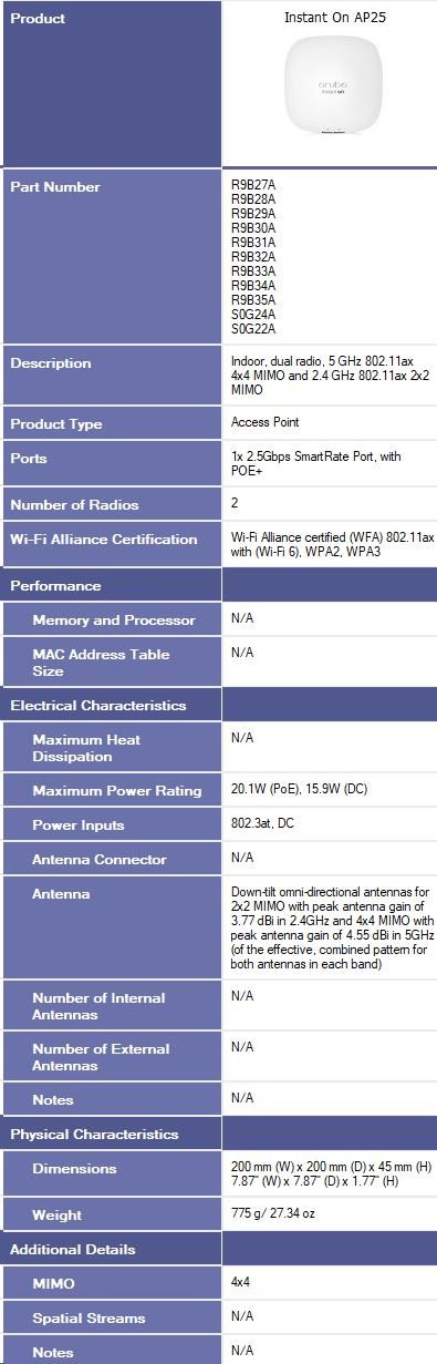 | Ultra-high-speed performance for high-density small businesses. Perfect for gaming, boutique hotels, tech start-ups and professional offices. The rise of the remote and hybrid workplace has placed increased pressure on business networks. Existing Wi-Fi infrastructure is struggling to support the explosion of devices and bandwidthhungry applications - all contributing to spotty video calls and sluggish download speeds. The Aruba Instant On AP25, a 4x4 Wi-Fi 6 access point, is designed to meet the increasing volume of connected devices. Delivering superior performance, coverage, and speed at a competitive price, the AP25 is the perfect access point for small and growing businesses. The Wi-Fi Certified 6TM AP25 delivers faster Wi-Fi speeds, greater capacity, and reduced latency between access points and devices for a superior Wi-Fi experience. AP25 improves efficiency and reduces congestion for networks with many connected devices, making it ideal for high-density environments. And with 4x the capacity of 802.11ac access points, the AP25 provides exceptional user experience, allowing businesses to serve more customers with higher speed and less congestion. Features of the AP25 include orthogonal frequency-division multiple access (OFDMA), multi-user MIMO and target wake time (TWT). With up to 4 spatial streams (4SS) and 160MHz channel bandwidth (HE160), the AP25 provides groundbreaking wireless capabilities for businesses looking to boost performance and future-proof their networks. |