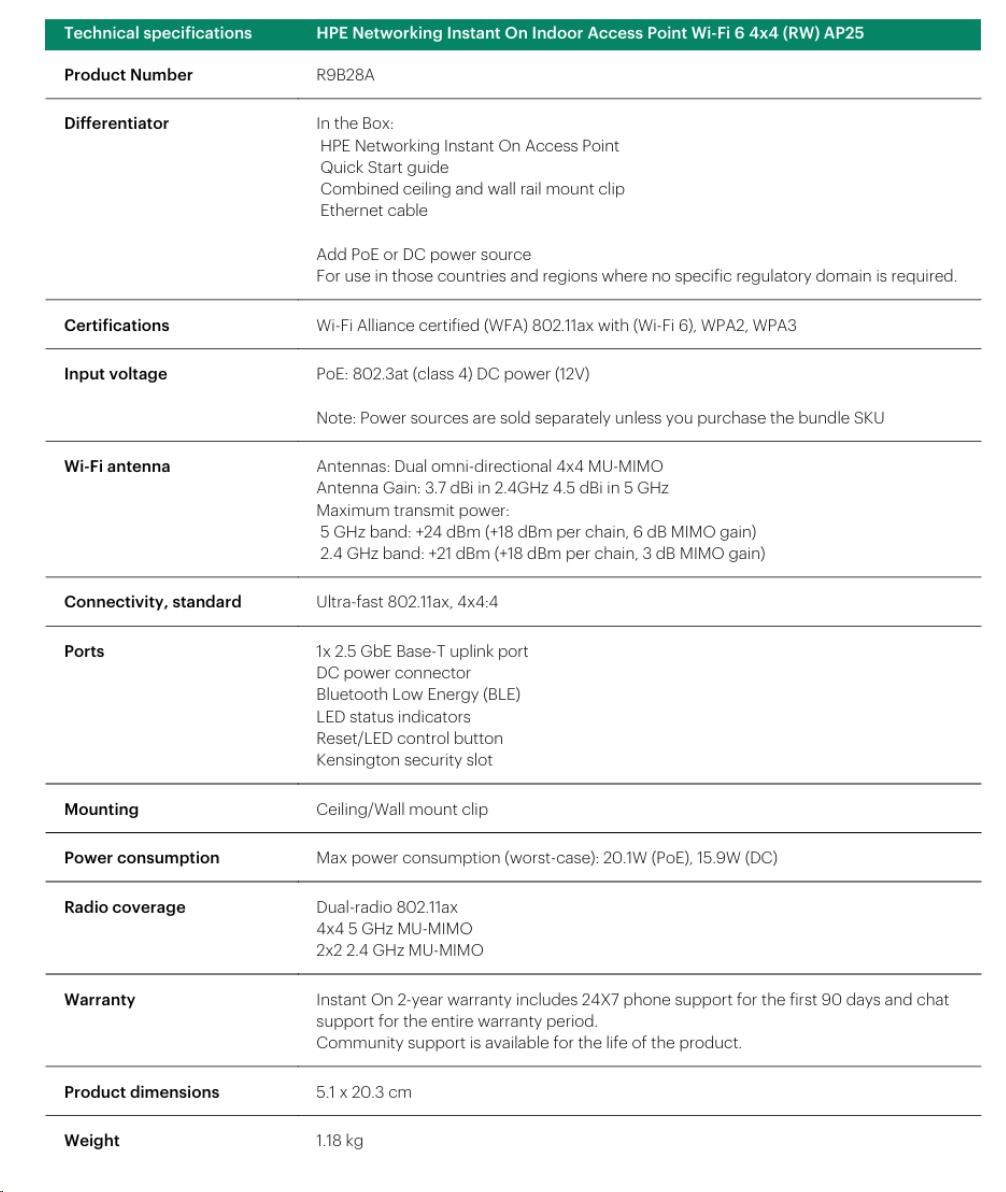 HPE Networking Instant On Indoor Access Point Wi-Fi 6 4x4 (RW) AP25 (R9B28A)