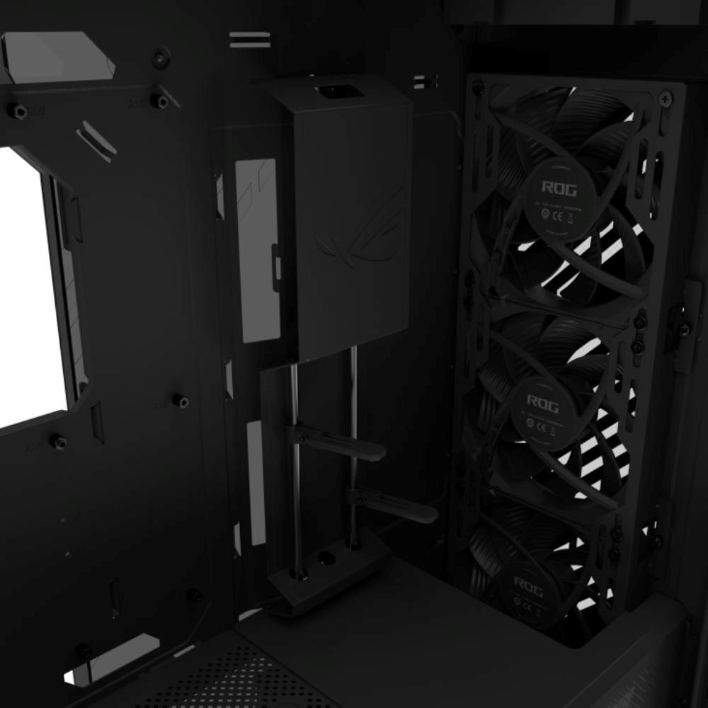 Herní skříň ROG Strix Helios II EATX typu mid-tower s dvojitými bočními panely z tvrzeného skla, podporou grafické karty o délce až 450 mm, hliníkovým rámem a předním panelem, výztuhami pro grafickou kartu a podporou 420mm radiátoru
