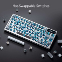 Zakázková herní klávesnice ROG Azoth s tvarovým faktorem klávesnice 75, těsněním, třívrstvou tlumicí pěnou a kovovým horním krytem, vysoce přizpůsobitelná s předem namazanými mechanickými spínači ROG NX vyměnitelnými za provozu, stabilizátory klávesnice ROG, kryty kláves PBT doubleshot a mazací sadou, tri - připojení režimu s 2,4 GHz technologií SpeedNova, OLED displejem, třícestným ovládacím knoflíkem, třemi úhly náklonu a podporou Mac