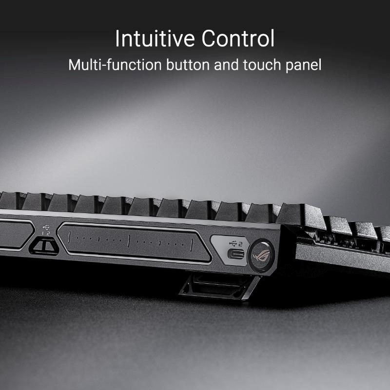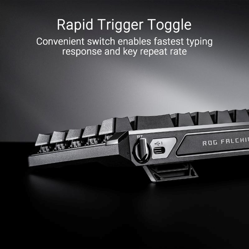 ROG Falchion Ace HFX 65% analogová herní klávesnice s magnetickými spínači ROG HFX, přepínač Rapid Trigger, režim Speed ??Tap, interaktivní dotykový panel, obnovovací frekvence 8000 Hz, pětivrstvé tlumení a silikonové těsnění, duální porty Type-C, tři úhly sklonu a krycí pouzdro