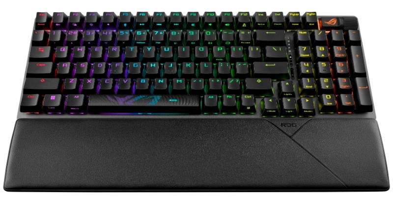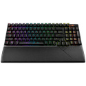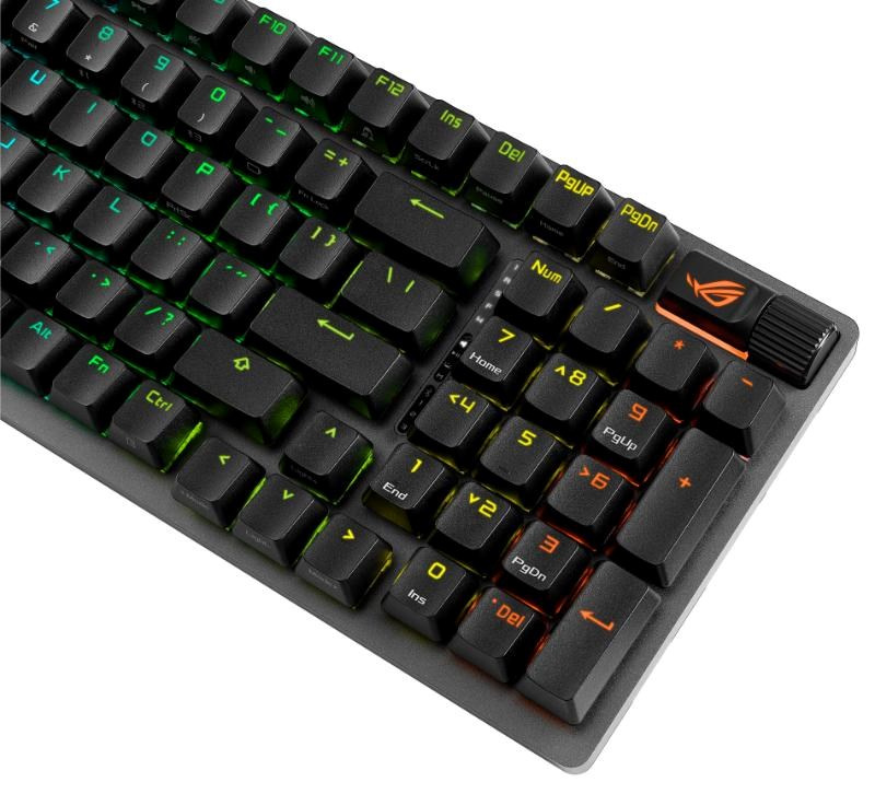 Herní klávesnice ROG Strix Scope II s předem namazanými mechanickými spínači ROG NX Red, pěnou tlumící zvuk, dvojitými krytkami kláves PBT nebo ABS s UV povlakem, klávesovými zkratkami pro streamování, multifunkčními ovládacími prvky, třemi úhly sklonu a opěrkou zápěstí