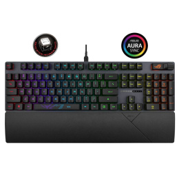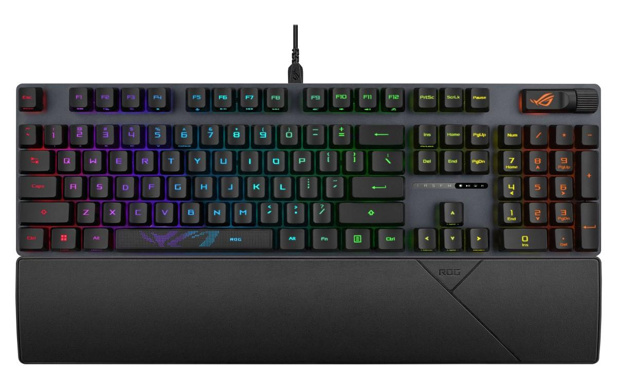 Herní klávesnice ROG Strix Scope II s předem namazanými mechanickými spínači ROG NX Red, pěnou tlumící zvuk, dvojitými krytkami kláves PBT nebo ABS s UV povlakem, klávesovými zkratkami pro streamování, multifunkčními ovládacími prvky, třemi úhly sklonu a opěrkou zápěstí