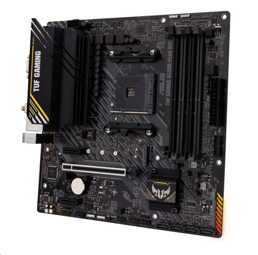 AMD A520 (Ryzen AM4) micro ATX gaming motherboard with M.2 support, 802.11ac Wi-Fi, DisplayPort, HDMI, D-Sub, USB 3.2 Gen 1 ports, SATA 6 Gbps, and AURA Addressable Gen 2 headers.
