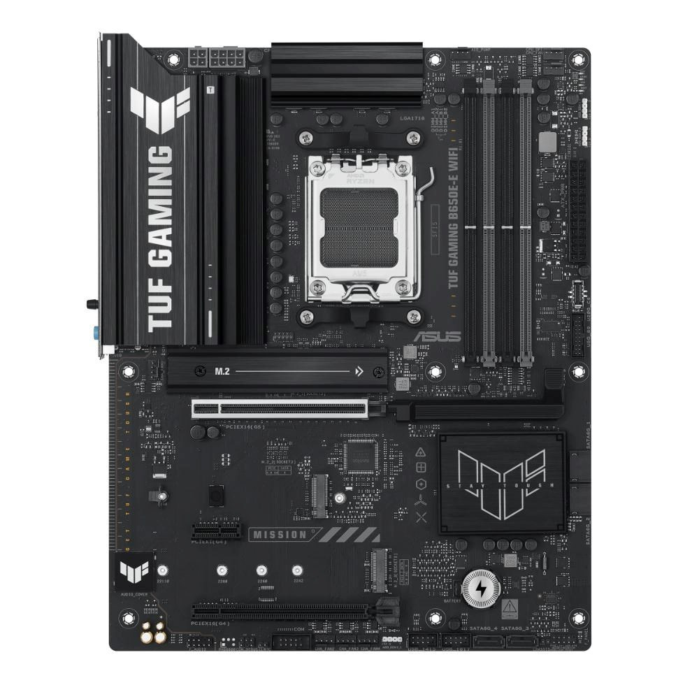 ASUS TUF GAMING B650E-E WIFI takes all the essential elements of the latest AM5 Socket for AMD Ryzen™ Desktop Processors and combines them with game-ready features and proven durability. Engineered with military-grade components, an upgraded power solution and a comprehensive cooling system, this motherboard goes beyond expectations with rock-solid and stable performance for marathon gaming. TUF GAMING motherboards also undergo rigorous endurance testing to ensure that they can handle conditions where others may fail. Aesthetically, this model incorporates rugged off-black and geometric design elements to reflect the dependability and stability that defines the TUF GAMING series. This platform delivers the power and connectivity that advanced AI PC applications demand.