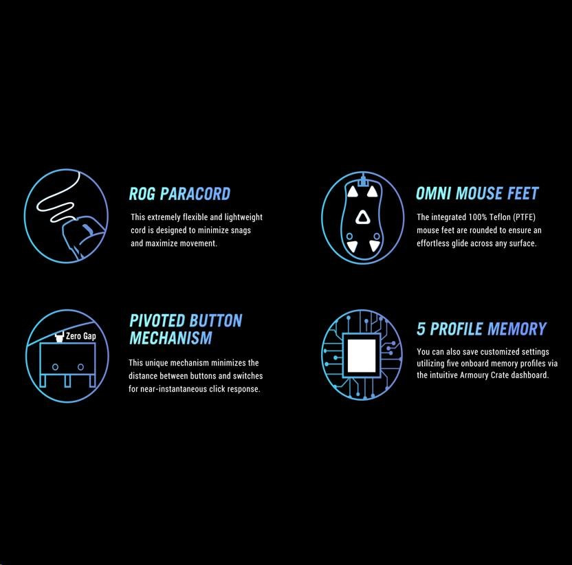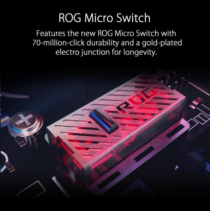 • ROG Micro Switches - The new ROG Micro Switches feature a 70-million-click lifespan and a gold-plated electro-junction to improve durability. Strict ROG manufacturing standards ensure that each individual switch is inspected and sorted, pairing left and right switches to keep force deviation within +/- 5 gram-force for a consistent click feel.