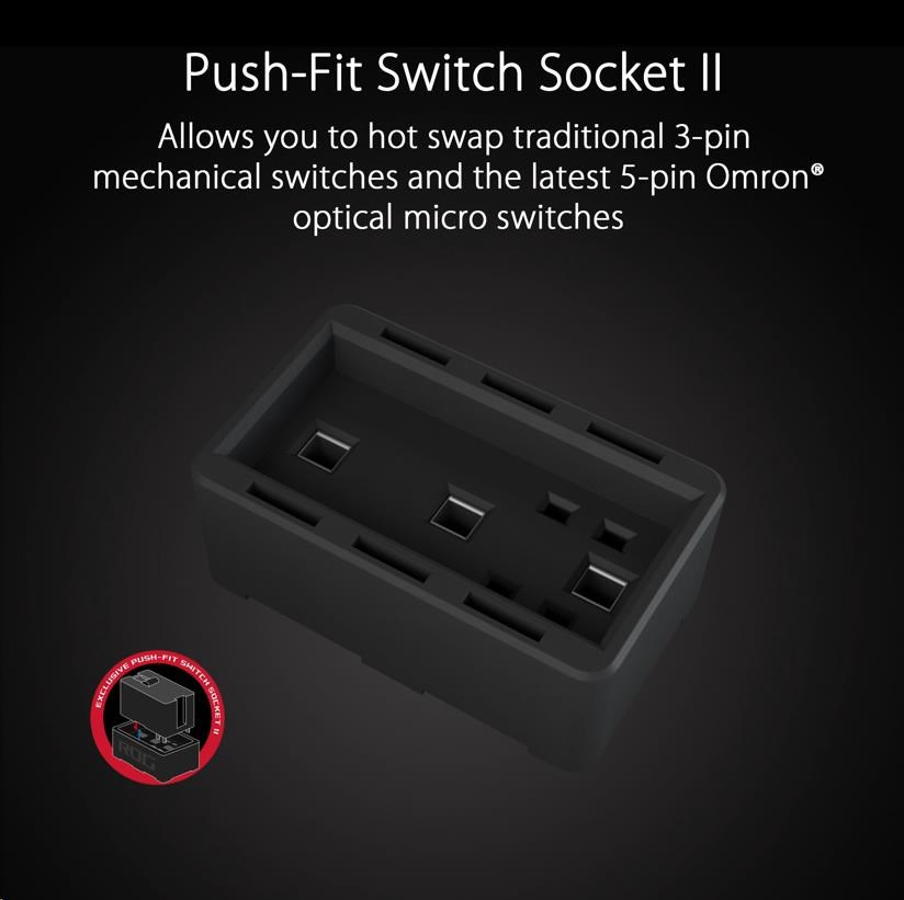• Push-Fit Switch Socket II - The world’s first Push-Fit Switch Socket II design allows you to hot swap traditional 3-pin mechanical switches and the latest 5-pin Omron® optical micro switches.