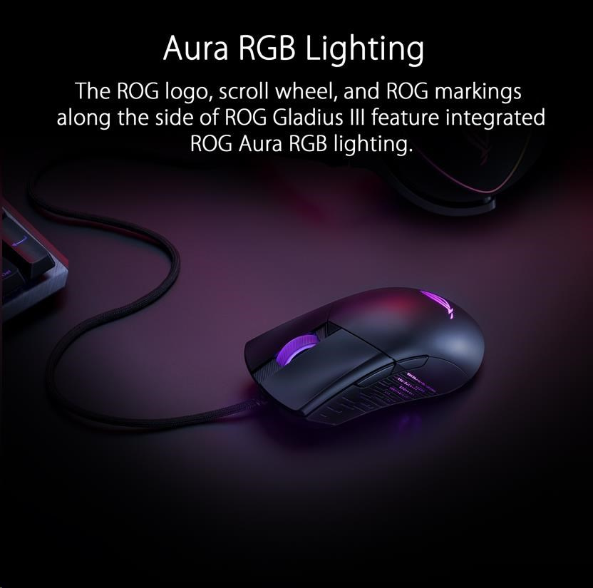 • Aura RGB Lighting - The ROG logo, scroll wheel, and ROG markings along the side of ROG Gladius III feature integrated ROG Aura RGB lighting. The laser-engraved side panel also features special flicker effects that can be customized with the color of your choice.