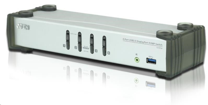 Aten CS1914 4-port DisplayPort KVMP 3.0 přepínač umožní jednomu uživateli sdílet čtyři připojené počítače za pomocí jedné klávesnice, myši a monitoru.
