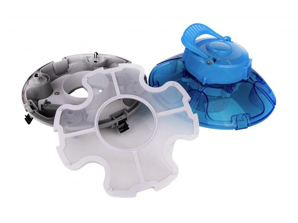 Vyčištění vysavače od nasbíraných nečistot je snadné. Otevřením čtyř přezek se vysavač rozdělí na dvě části (motor a filtr), vyprázdníte a opláchnete síto pod tekoucí vodou.