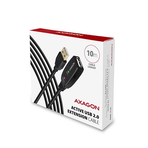 Aktivní prodlužovací USB 2.0 kabel AXAGON ADR-210 délky 10 metrů je ideální k propojení Vašeho počítače s USB zařízením jako je myš, klávesnice, webkamera, tiskárna, skener, plotr a dalšími. Aktivní USB repeater kabel zesiluje průchozí signál a umožnuje připojit USB zařízení na výrazně větší vzdálenost, než Vám umožní pasivní kabel. Dosah kabelu je možné dále prodloužit použitím několika kabelů za sebou.