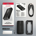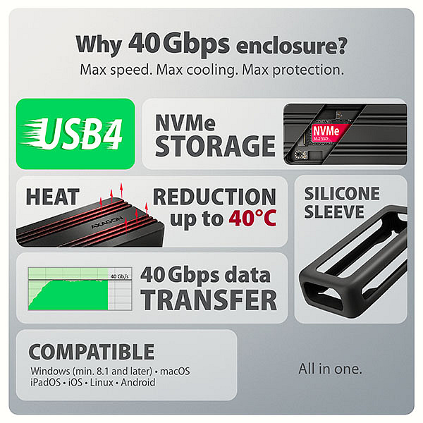 Rychlý externí AXAGON EEM2-40G ARMORED box s USB4 rozhraním umožňuje využít vysoký výkon M.2 NVMe SSD disků s minimálním throttlingem a stabilním provozem. Přenosová rychlost až 40 Gb/s a široká kompatibilita včetně Thunderbolt rozhraní z něj dělají spolehlivé řešení pro náročné použití, například při práci s MacBookem. Odolné hliníkové tělo slouží zároveň jako pasivní chladič a spolu se silikonovým návlekem chrání zařízení při každodenním používání. Záloha až 1 TB dat za přibližně 10 minut, střih 4K videa přímo z externího disku nebo využití staršího NVMe SSD jako rychlého přenosného úložiště, to vše zvládnete s jedním zařízením. Součástí balení je USB-C 40Gbps kabel.