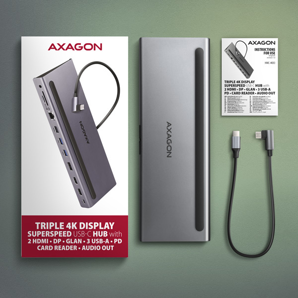 Multiportový USB-C 5Gbps TRIPLE 4K DISPLAY hub AXAGON HMC-4KX3 rozšíří Váš notebook o devět portů a čtečku paměťových karet SD / microSD. Přes oboustranný USB-C konektor snadno a rychle připojíte k počítači až tři monitory, tři USB zařízení, Gigabitovou ethernet síť, sluchátka a čtečku karet současně. Zároveň získáte možnost napájení notebooku pomocí technologie Power Delivery. USB-C hub tak zastane funkci univerzální a výkonné dokovací stanice 11v1 pro moderní notebooky.