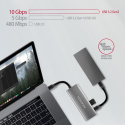 Dva USB-A 10Gbps výstupy umožňují připojení externích disků, flash disku, myši, tiskárny a dalšího USB příslušenství. USB porty také nabíjí mobilní telefony a tablety proudem až 1.5A. Hub je také vybaven kombinovaným USB-C portem, který může být použit pro přenos dat (USB 10Gbps), nebo pro nabíjení notebooku pomocí Power Delivery nabíječky. S využitím vhodné PD nabíječky tak napájíte nejen notebook, ale i samotný hub, s výkonem až 60W díky technologii Power Delivery 3.0.