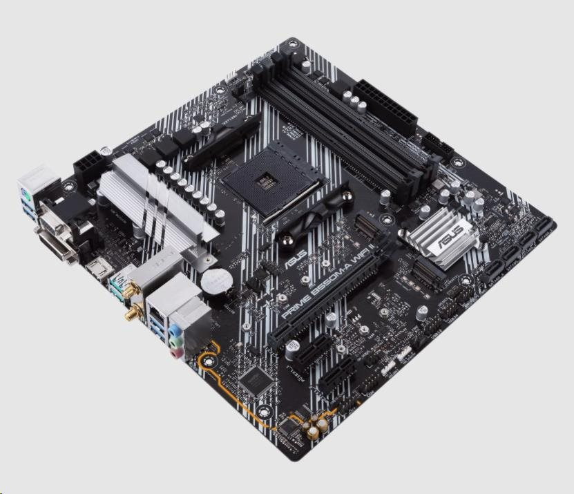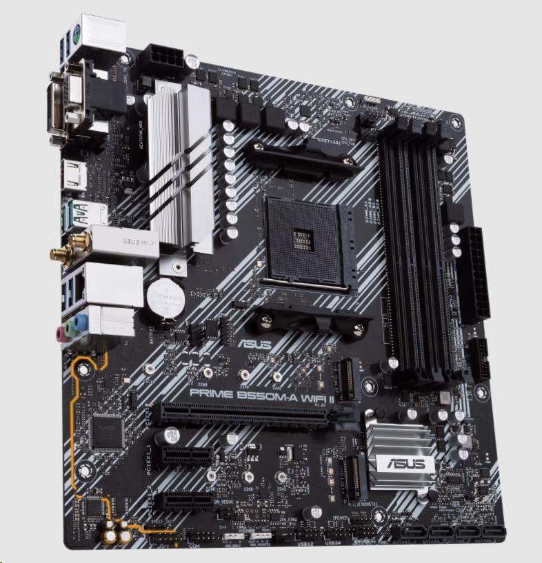 AMD B550 (Ryzen AM4) micro ATX motherboard with dual M.2, PCIe 4.0, Wi-Fi 6, 1 Gb Ethernet, HDMI, DVI-D, D-Sub, SATA 6 Gbps, USB 3.2 Gen 2 Type-A, and Aura Sync RGB lighting support