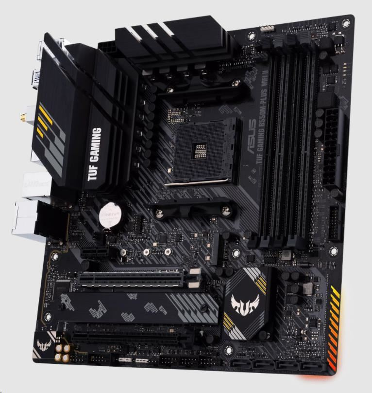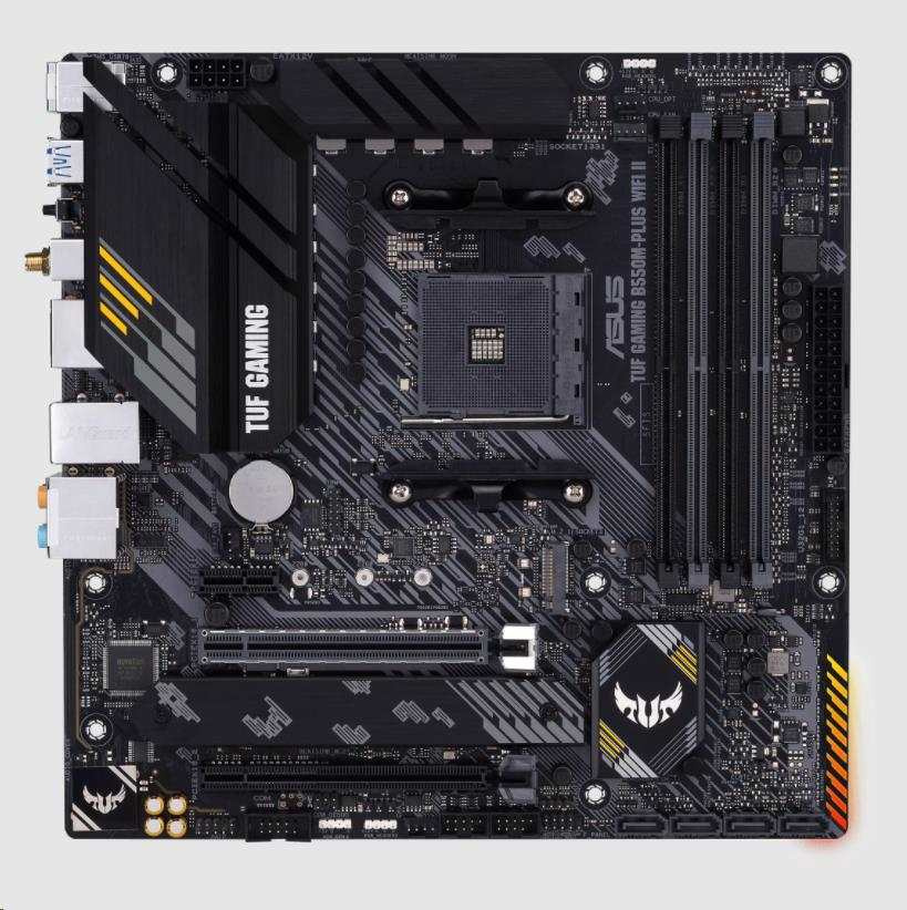 AMD B550 (Ryzen AM4) micro ATX gaming motherboard with PCIe 4.0, dual M.2, 10 DrMOS power stages, Wi-Fi 6, 2.5 Gb Ethernet, HDMI, DisplayPort, SATA 6 Gbps, USB 3.2 Gen 2 Type-A and Type-C®, BIOS FlashBack™, and Aura Sync RGB lighting support