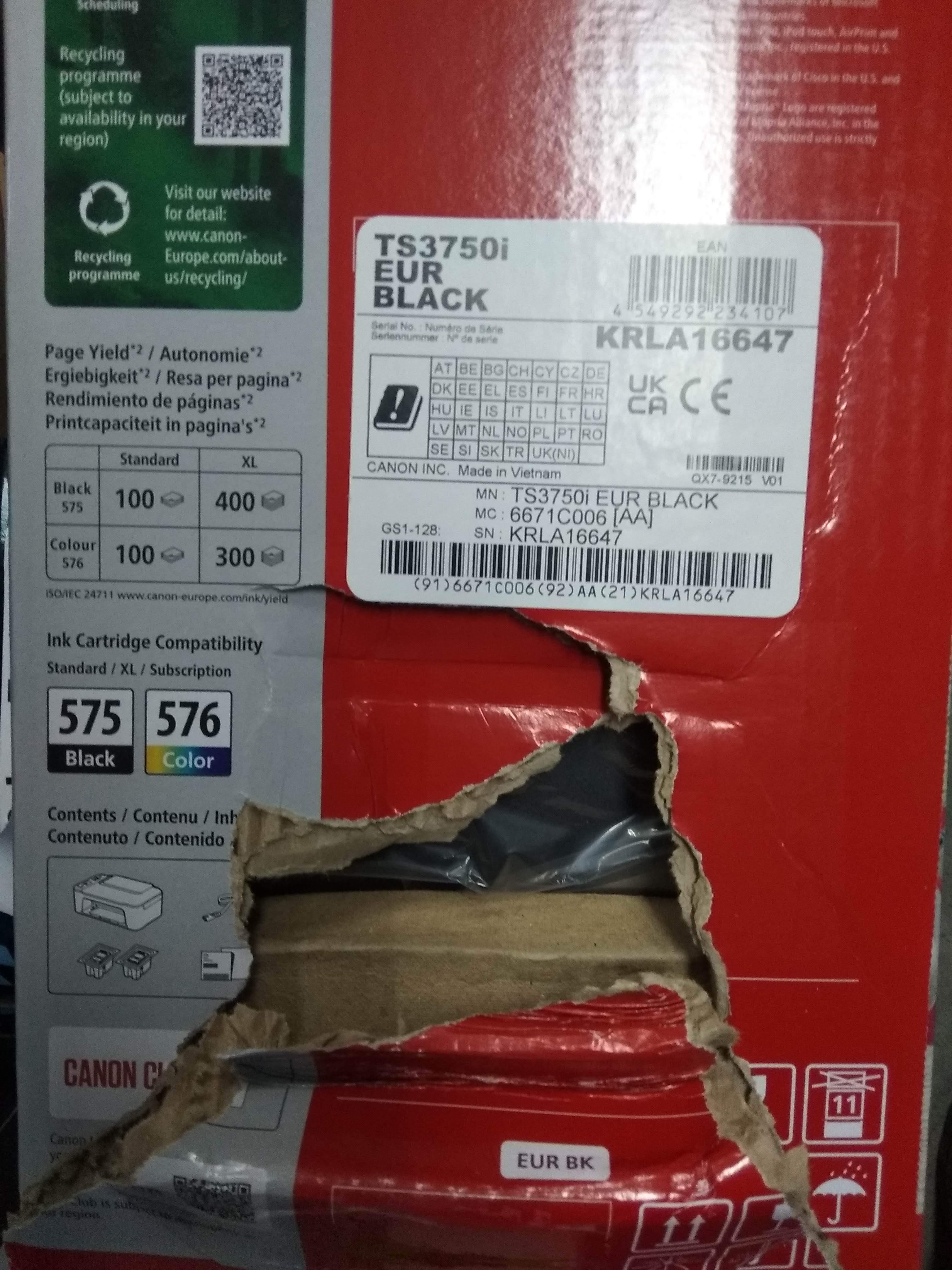 Popis BAZAR -Canon PIXMA Tiskárna TS3750i black - barevná, MF (tisk, kopírka, sken, cloud), USB, Wi-Fi ( poškodený obal )