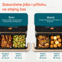 Fritéza disponuje důmyslnou funkcí Sync. Pokud koš rozdělíte na dva a chcete připravit dvě různá jídla, stiskem tlačítka Sync docílíte synchronizace vaření a dokončení ve stejný moment. Hotová příloha se tak nebude vysušovat při čekání na hotový hlavní chod. Funkce Match pak dovolí rychle nastavit stejný program v obou koších bez nutnosti dělat dvakrát to samé.