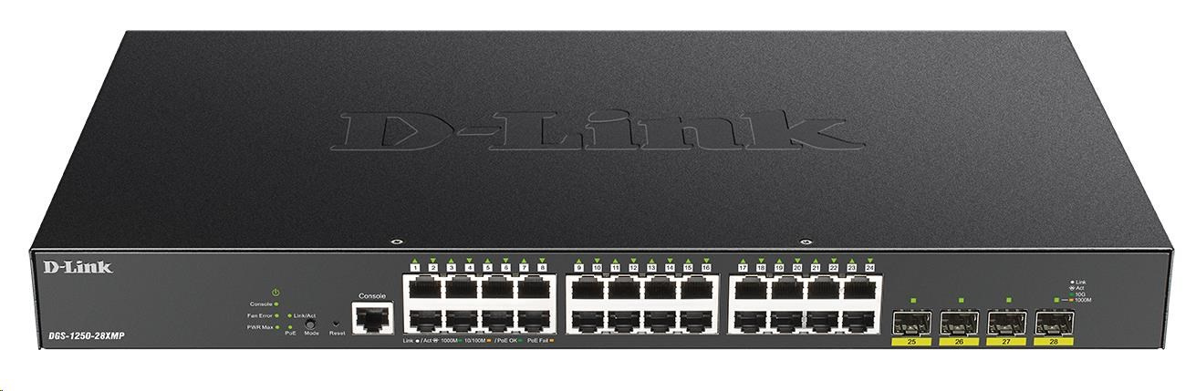 BAZAR - D-Link DGS-1250-28XMP 28-port Gigabit Smart PoE Switch, 24x GbE PoE+, 4x SFP+, PoE 370W - Poškozený obal (Komple