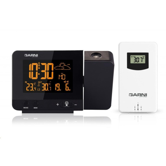Meteorologická stanice se špičkovým inverzním barevným VA displejem s časem řízeným rádiovým signálem DCF-77, budíkem, měřením vnitřní teploty, bezdrátovým čidlem pro měření vnější teploty a projekcí času a vnitřní / venkovní teploty inverzní barevný VA displej o rozměrech 63 x 42 mm s možností stálého osvětlení při napájení síťovým adaptérem, nebo krátkodobým osvětlením na 15 s při napájení bateriemi 3 stupně jasu osvětlení displeje, možnost vypnutí osvětlení displeje s možností krátkodobého osvětlení na 15 s (při napájení síťovým adaptérem) lze nastavit až 70 barev displeje, nebo režim automatického plynulého střídání barev možnost rychlé volby 8 barev osvětlení displeje velikost číslic na displeji – čas 22 mm, datum, vnitřní a vnější teplota 10 mm, zkratka názvu dne 7 mm čas a datum řízené signálem DCF-77 s možností manuálního nastavení ikona příjmu signálu DCF-77 zkratka názvu dne 12ti, nebo 24 hodinový formát zobrazení času možnost nastavení časového pásma od -1 do +2 hodin budík s 2 budícími časy s funkcí opakovaného buzení (Snooze) po 5 minutách budící signál - 20 sekund 1 pípnutí za sekundu, 20 sekund 2 pípnutí za sekundu, 20 sekund 4 pípnutí za sekundu a poté stálé pípání střídavá projekce času a vnitřní a vnější teploty (teploty se střídají co 5 s) s možností otočení obrazu o 180°, možnost sklopení tubusu projektoru o 90° dopředu a dozadu barva projekce červená stálá projekce při napájení síťovým adaptérem s možností vypnutí 6 animovaných ikon předpovědi počasí (slunečno, polojasno, oblačno, srážky, silný déšť a sněžení) na základě sledování barometrického tlaku vestavěným barometrickým čidlem možnost nastavení výchozí ikony předpovědi počasí zobrazení hodnot vnitřní a vnější teploty paměť na maximální a minimální naměřené hodnoty teploty s automatickým mazáním v 0:00 hodin šipky tendence vývoje barometrického tlaku, vnitřní a vnější teploty indikace námrazy vnější teploty v rozsahu od -1°C do +3°C ikonou na displeji zobrazení teploty ve °C, nebo °F možnost použití až 3 bezdrátových čidel GARNI 029 (jedno čidlo GARNI 029 je součástí dodávky) bezdrátový přenos hodnot vnější teploty na frekvenci 433 MHz ikona příjmu signálu bezdrátového čidla USB port pro nabíjení mobilních zařízení (pouze při napájení hlavní jednotky síťovým adaptérem), maximální nabíjecí proud 1 000 mA ikony slabých baterií napájení síťovým adaptérem, nebo bateriemi možnost postavení barva černá Bezdrátové čidlo GARNI 029 vlhkosti odolné displej o rozměrech xxxxxx mm velikost číslic na displeji: teplota xxxxxx mm měření teploty 3 kanály maximální RF výkon 10 dBm (10 mW) možnost postavení a zavěšení barva bílá Obsah balení: 1 x hlavní jednotka GARNI 365 Arcus 1 x bezdrátové čidlo GARNI 029 1 x síťový adaptér český, slovenský, německý, anglický, italský, polský a maďarský návod.