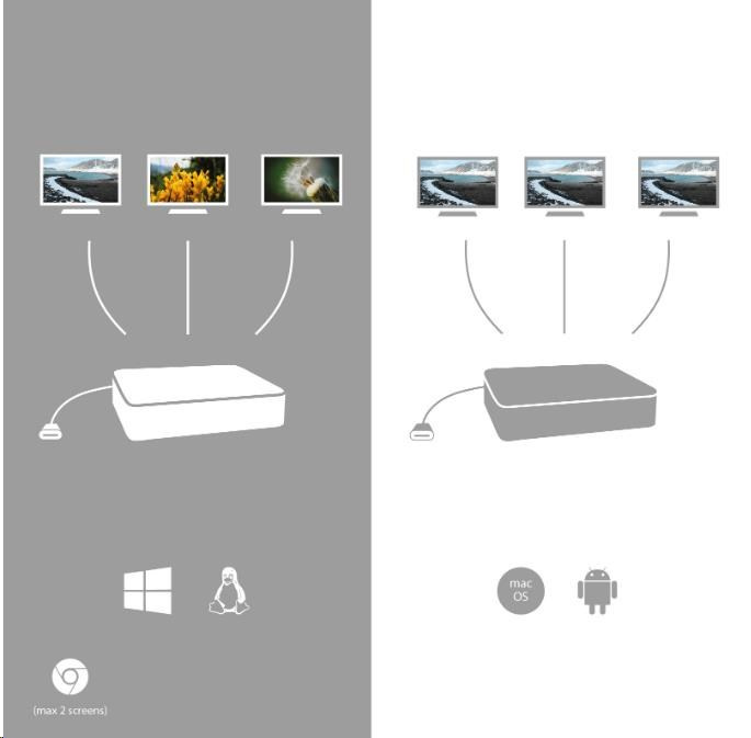 1/ Operační systém macOS nepodporuje technologii více-obrazového video přenosu Multi Stream Transport (MST), což znamená, že v případě připojení k macOS bude na všech připojených monitorech promítnut stejný obraz.