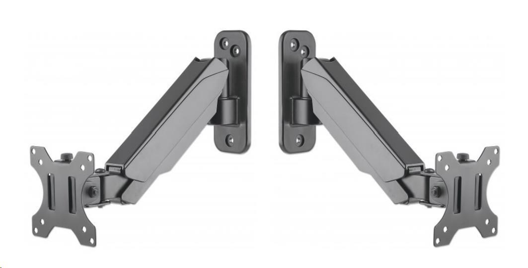 The Manhattan Universal Gas Spring Monitor Wall Mount offers a single-jointed gas-spring arm to securely hold one 17" to 32" TV or monitor. This mount's gas spring promotes easy movement of the monitor or TV to a more comfortable viewing angle with the lightest touch. Designed to be installed on the wall to give back much-needed desktop real estate, the Manhattan Universal Gas Spring Monitor Wall Mount provides more flexibility, reach, and overall enjoyment of whatever task is at hand.