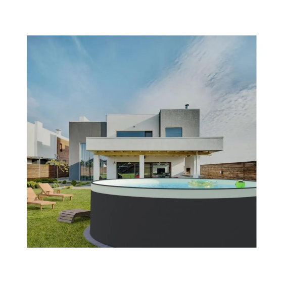 Nadzemní bazény Planet Pool s ocelovou stěnou jsou určeny pro celoroční použití. Odpadá tak potřeba bazén demontovat na podzim a znovu instalovat na jaře jako u sezónních bazénů s nafukovacím límcem či rámovou konstrukcí. Díky žárově pozinkované a nátěrem ošetřené ocelové stěně a mrazuvzdorné fólii je bazén připraven na všechny rozmary přírody. Tento bazén je velmi stabilní, pevný s dlouhou životností. Moderní ANTRACITOVÝ nátěr stěny bazénu + PÍSKOVÁ PVC závěsná folie. Bazén je vhodný pro instalaci na rovném podkladu s dostatečným odstupem od potenciálního spadu nečistot ze stromů a střech. UV stabilizace PVC folie zajišťuje je barevnou stálost a životnost. Tento bazén přestavuje osvědčenou koncepci bazénu a pozitivní historickou zkušenost. Bazén se instaluje pomocí spodních a horních lišt, do kterých se zasazuje ocelová stěna. Oba kraje stěny se propojí pomocí vnitřních a vnějších lišt a šroubů. Mrazuvzdorná folie se pomocí zalomení o horní část ocelové stěny zavěsí a vytvaruje do bazénu dle vizuálních požadavků. Folie je flexibilní a na míru vyrobena pro tento typ bazénu (není třeba žádných úprav). Pro montáž krok za krokem následujte pokyny v montážním návodu. Parametry: Tvar bazénu: kulatý tvar Rozměry bazénu: 350 x 90 cm Ocelová stěna: 0,3 mm UV stabilizovaná PVC fólie, tloušťka 0,2 mm, barva PÍSKOVÁ Barva bazénu: ANTRACITOVÁ Děrování pro standardní vestavěný skimmer a zpětnou trysku k dispozici Horní a podlahová lišta z plastu Bazén odpovídá evropské normě pro bazény EN 16562-2.