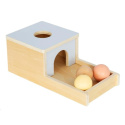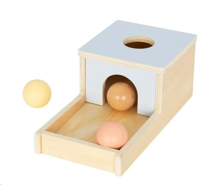 Dřevěný box (bedýnka) s dřevěnými koulemi v přírodních pastelových barvách seznámí miminko s vlastnostmi objektů (předmětů), v tomto případě dřevěných koulí. 3 dřevěné koule v přírodním provedení a v jemných pastelových barvách mizí v dřevěném domečku (boxu), aby se pak dveřmi vykutálely do dřevěné zahrádky (ohrádky). Tuto záhadu musí každé dítko vyřešit a tak bude tuto zábavnou činnost opakovat znovu a znovu. Při opakované hře děti zdokonalují své dovednosti, zabaví se a užijí si spoustu legrace.