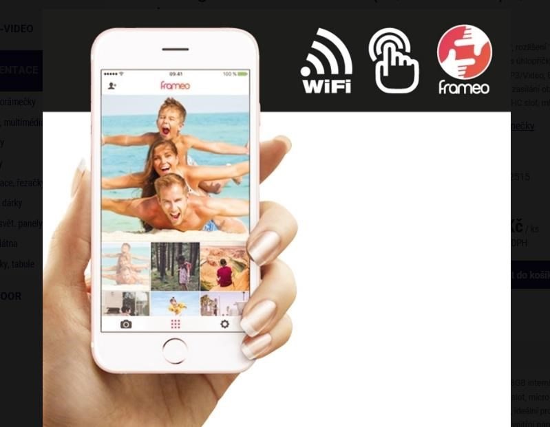 https://reflecta.de/ WiFi digitální fotorámeček s úhlopříčkou 7", rozlišení 1024x600px, 16:9 IPS, přehrávání JPEG/MP3/Video, 8GB interní paněť, aplikace FRAMEO (Android/iOS, FREE) pro zasílání obrázků a videí z telefonu, G-senzor pro h/v pozici, micro SDHC slot, micro USB, černý. WLAN modul 802.11 b/g/n, opěrka na stůl, jednoduchá obsluha a nastavení pomocí bezplatné aplikace FRAMEO, ideální pro aktualizaci obsahu a nastavení rámečku z telefonu doma i na cestách, možnost horizontálního i vertikálního provozu, vnitřní paměť pro až 999 obrázků, maximální doba pro video 15s, , micro SD karty do 32GB. Rozměry 195x126x17mm, hmotnost 306g, síťový zdroj 5V/2A..
