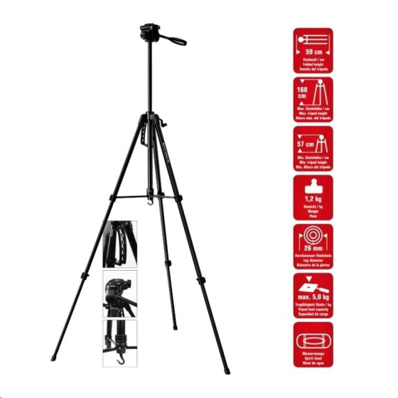 Lehký hliníkový foto/video stativ, 3-směrná hlava s výměnnou destičkou, vodováha, 3 segmenty noh se svorkami, profil 26mm, zatížení maximálně 5kg, rozměry: složený 59cm / výška 57-160cm, hmotnost 1200g, barva černá, včetně pouzdra. Středový sloupek se vzpěrami pro vyšší stabilitu, nastavení výšky kličkou, háček na pověšení příslušenství nebo závaží, plastové ucho pro transport, nohy zakončené gumou..