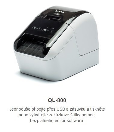 | Kazety s páskou | 29 mm x 90 mm standardní adresní štítky s černým tiskem na bílé (100 štítků) - 62 mm černý / červený tisk na kontinuální papírové roli (5 metrů) |
