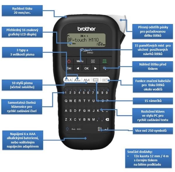 Popis BROTHER tiskárna štítků PT-H110 - 12mm, pásky TZe - popisovač