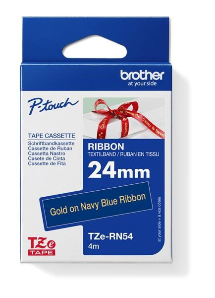 Popis BROTHER TZE-RN54 - kazeta TZ šířky 24mm, TEXTILNÍ páska 4m- pro tvorbu dárků - NELEPÍCÍ - MODRÁ PÁSKA, ZLATÝ POTISK gold