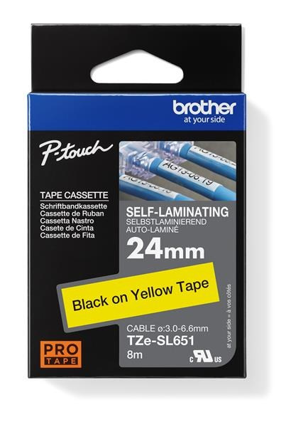 Samolaminovací páska TZe-SL651 s délkou 24 mm s černým tiskem na žluté byla vyvinutá pro dlouhodobou identifikaci síťových kabelů. Má speciální lepicí vlastnosti štítků pro trvanlivé pevné ovinutí kolem vašich vodičů a kabelů. Kompatibilní s některými modely P-touch, které používají pásky TZe 24 mm a 36 mm.