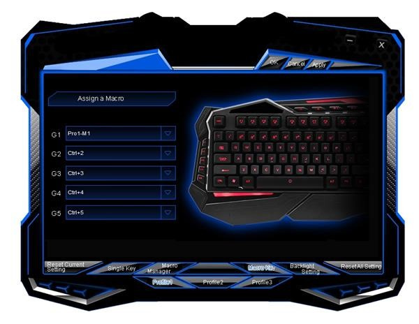 3 profily - na klávesnici naleznete klávesy pro přepínání mezi 3 nezávislými profily. Pro každý profil lze individuelně nastavit barva podsvícení, její intenzita, makra, předefinované klávesy...