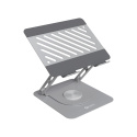 Quallis NTS-200 podporuje notebooky až do velikosti 16" a jeho pevná hliníková konstrukce zajišťuje vysokou odolnost, nosnost a elegantní vzhled. Na rozdíl od běžných stojanů je vybaven otočnou základnou s 360° rotací, což umožňuje plynulé natáčení notebooku bez nutnosti přemisťování celé konstrukce – ideální při prezentacích, sdílení obrazovky nebo střídavé práci více uživatelů.