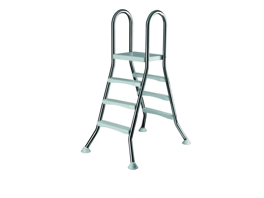 Bazénový žebřík pro bazény se stěnou až 90 cm, vyrobený z kvalitní nerezové oceli, která zajistí jeho dlouhou životnost. Žebřík má silné stabilní plastové schodnice a plošinu s protiskluzovou úpravou , udrží hmotnost až 150 kg. Žebřík má 3 stupně na vnitřní a vnější straně. Nohy žebříku jsou zakončeny koncovkami z protiskluzové gumy se stabilní podložkou, které zabraňují nechtěnému pohybu žebříku a zvyšují tak bezpečnost. Zároveň zabraňují poškození vašeho bazénu.