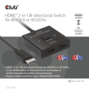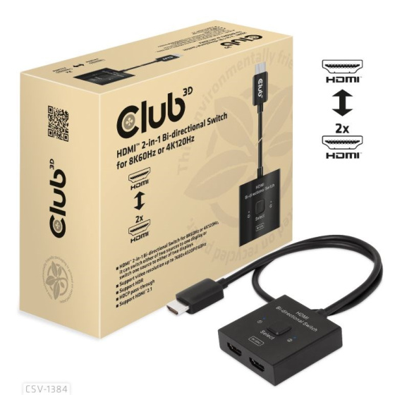Club 3D CSV-1384 je obousměrný přepínač HDMI™ 2-v-1 pro 8K60Hz nebo 4K120Hz. Může přepínat jeden ze dvou zdrojů na jeden displej nebo přepínat jeden zdroj na jeden ze dvou displejů. Stisknutím tlačítka přepínače vyberte kanál 1 nebo kanál 2. S kusem pevného kabelu HDMI™ (pigtail) o délce 0,5 m / 1,64 stopy tento přepínač nejen snižuje náklady, ale také šetří čas zákazníkům. Tento typ přepínače HDMI™ směruje video s vysokým rozlišením (ve více rozlišeních a až 8K60Hz) a digitální zvuk ze zdrojů do zobrazovacích jednotek.